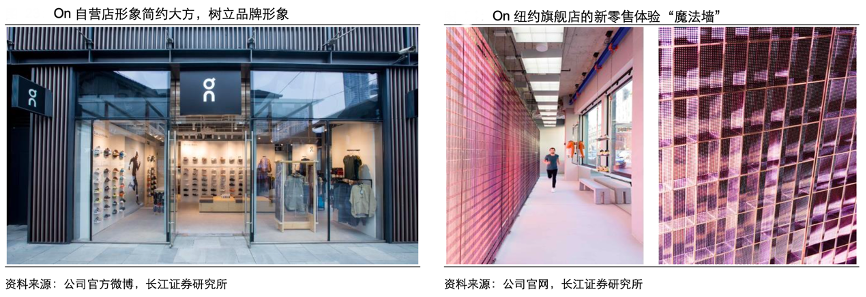 經(jīng)典案例:根據(jù)公司官方微博、公司官網(wǎng)、長江證券研究所等綜合資訊表明,On旗艦店和自營店主要起梳理品牌形象和培育消費者品牌認知的作用,adw 選址位于核心商圈且店鋪形象簡約,并以新零售體驗向消費者傳遞品牌的科技概念,如紐約旗艦店的“魔法墻”實時掃描購物者的跑步風格,以幫助他們找到適合其跑步風格和需求的鞋款。