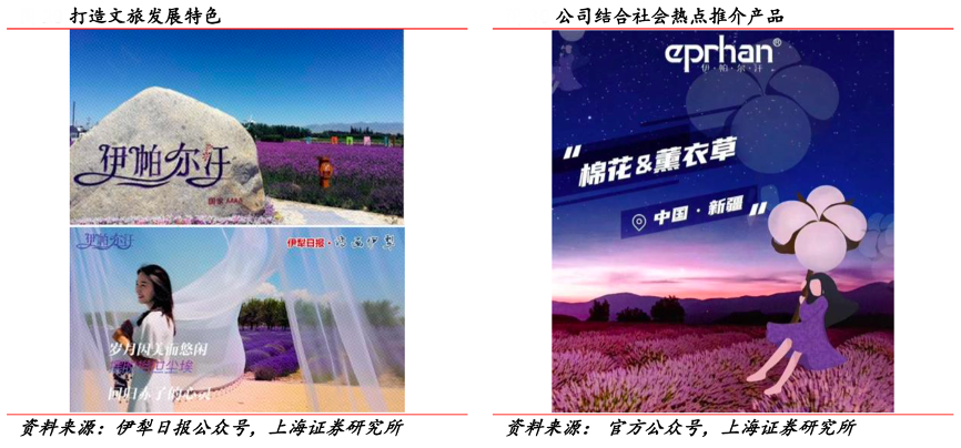 經典案例:根據伊犁日報公眾號、官方公眾號、上海證券研究所等綜合資訊表明,伊帕爾汗線下簽約數十家 CS 渠道代理商,線上布局多個新媒體平臺和電商平臺,通過直播、社群、福瑞達DTC品牌集群等渠道來進行拓展。線下與新疆農業、文旅部門等緊密合作,結合中國新疆產地優勢塑造品牌特色,以中 國薰衣草原產地溯源性標簽的 4A 級景區形象,通過線上文旅資源云展和線下制造業展播,打造薰衣草文旅融合雙發展。