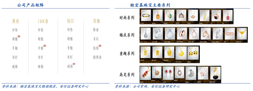 經(jīng)典案例:根據(jù)潮宏基珠寶天貓旗艦店、公司官網(wǎng)、安信證券研究中心等綜合資訊表明,潮宏基品牌已經(jīng)形成了時(shí)尚、婚慶、童趣和高定四大系列來(lái)滿(mǎn)足不同客群的需求。每個(gè)系列下包含吊墜、項(xiàng)鏈、手鏈、戒指、耳飾、手鐲、串珠這七大品類(lèi);材質(zhì)上除了主推的 K 金外,涵蓋黃金、鉆石、鉑金、珍珠以及彩寶等。以各大珠寶品牌的天 貓旗艦店為例,2022 年 3 月潮宏基珠寶 SKU 達(dá) 2667 個(gè),僅次于周大福位居行業(yè)第二。