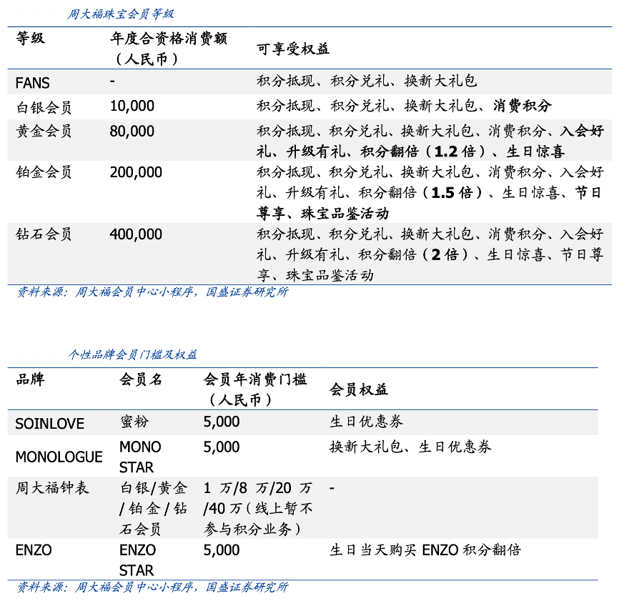 經(jīng)典案例:根據(jù)周大福會員中心小程序、國盛證券研究所等綜合資訊表明,周大福公司為會員準(zhǔn)備了專屬福利,會員可受邀參加 Good Living Plus(GLP+)會員計劃,以享受額外的獎賞優(yōu)惠,包括在與公司合作的商戶取得休閑、酒店與旅游優(yōu)惠。此外,客戶按照消費金額可享受不同級別的會員計劃,隨著會員級別的升高,會員將享有更多權(quán)利,包括積分抵現(xiàn)、積分翻倍、生日驚喜、節(jié)日尊享等,“鉑金會員”及“鉆石 會員”還有機會參與公司組織的線下高端沙龍和高端珠寶拍賣會活動。與此同時,顧客通過在個性化品牌店消費還可以獲得個性品牌專屬會員。