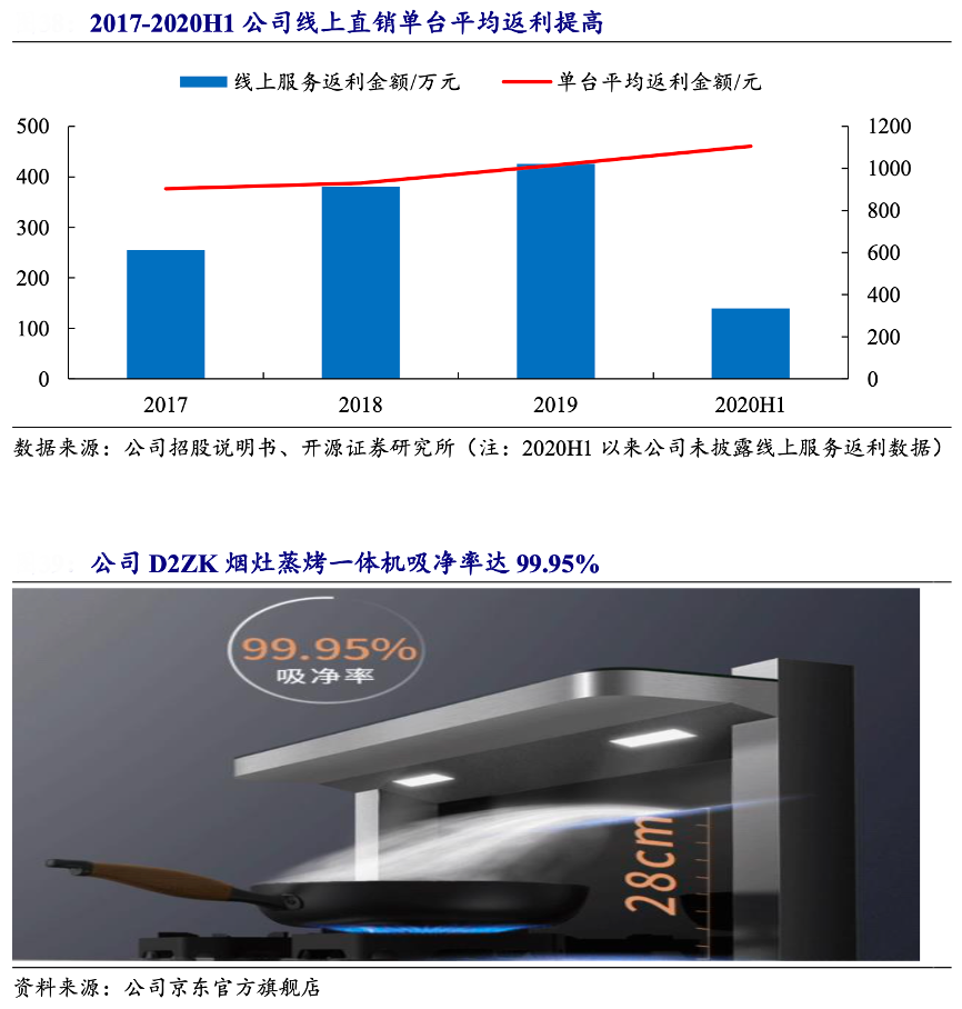 經典案例:根據公司招股說明書、公司京東官方旗艦店、開源證券研究所等綜合資訊表明,億田智能公司部分產品線上線下同款同傭,以線上為導流平臺獲取流量,初步與消費者互動,再引導消費者到門店體驗,提升對產品的感知 度,最后在網上下單成交,使得線上流量、線下互動有機結合。同款同傭策略打造線上爆品,進一步集聚流量,形成良性循環。2021 年,其線上主打產品 D2ZK 在“雙十一”期間實現單品破億,成為集成灶全網第一單品,有效提高品牌知名度。