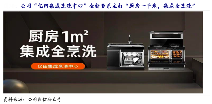 經典案例:根據公司微信公眾號、開源證券研究所等綜合資訊表明,2022 年 3 月,億田智能公司發布“億田集成烹洗中心”全新套系,推出 1 臺“蒸烤獨立 集成灶”+1 臺“集成水槽洗碗機”的搭配,主打“廚房一平米,集成全烹洗”,集成 智能烹飪+鮮蔬餐具洗等全功能,打造兼具美學、功能、空間、烹飪、場景這五大集成突破,完成對中國廚房邊界和生態的擴容,覆蓋食材接入、烹飪產出、餐后處理等一系列環節的完整通路。