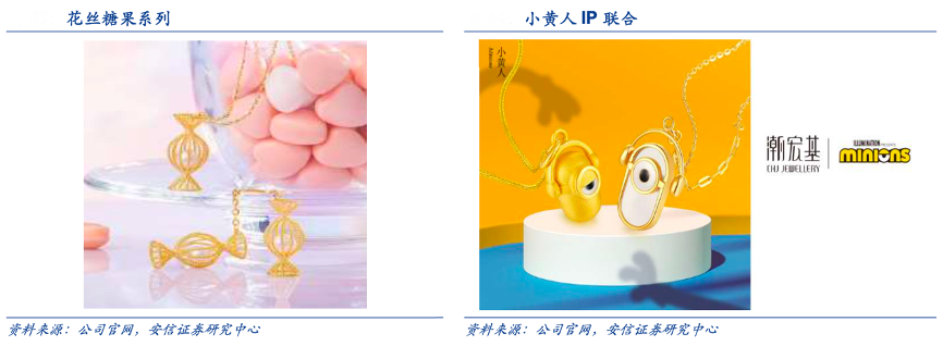經(jīng)典案例:根據(jù)公司官網(wǎng)、安信證券研究中心等綜合資訊表明,為進(jìn)一步強(qiáng)化“國(guó)潮”品牌形象,潮宏基公司于2021年與同樣擁有東方文化情懷的品牌花西子攜手,推出并蒂同心足金手鏈。此外,潮宏基通過與小黃人、哆啦A 夢(mèng)和精靈寶可夢(mèng)等 IP 的深度合作,在俘獲年輕人喜愛的同時(shí)優(yōu)化公司產(chǎn)品結(jié)構(gòu)。