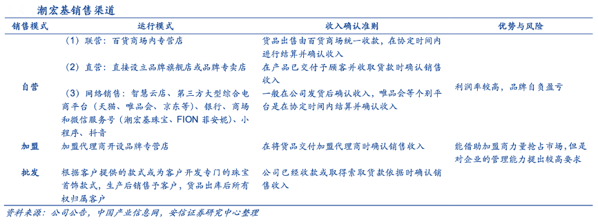 經(jīng)典案例:根據(jù)公司公告、中國(guó)產(chǎn)業(yè)信息網(wǎng)、安信證券研究中心等綜合資訊表明,潮宏基珠寶的銷售渠道主要分為自營(yíng)、加盟代理和批發(fā)。目前,自營(yíng)渠道貢獻(xiàn)了其大部分營(yíng)收,加盟代理渠道占比增速明顯。根據(jù)公司年報(bào)數(shù)據(jù),2021 年自營(yíng)、加盟代理和批發(fā)收入占比分別為 67.01%、28.98%和 1.89%。