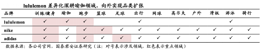 經典案例:根據各公司官網、國泰君安證券研究等綜合資訊表明,在瑜伽運動市場尚為藍海之時,lululemon差異化定位于瑜伽運動,與其余運動品牌形成錯位競爭,成功在大牌云集的運動行業立足,并樹立起品牌標簽。此后lululemon 也逐步向跑步、網球、健身等領域拓展,盡管其他運動品牌也紛紛布局以瑜伽為代表的女子運動領域,但 lululemon 憑借先發優勢在瑜伽領域一枝獨秀。