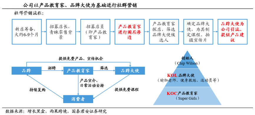 經典案例:根據增長黑盒、雨果跨境、各公司官網、國泰君安證券研究等綜合資訊表明,lululemon 從創立至今始終堅持精準的社群營銷,這種營銷方式以產品教育家、品牌大使為基礎,通過宣傳介紹產品性能、開展社群活動,達到教育消費者的目的,進而使其主動選擇購買公司產品并推薦給親朋好友。
