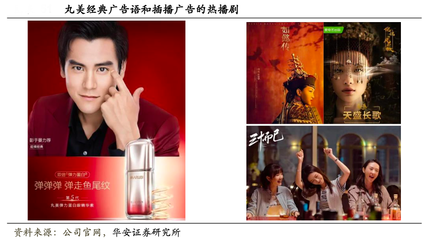 經(jīng)典案例:根據(jù)公司官網(wǎng)、華安證券研究所等綜合資訊表明,2007年丸美與央視開展廣告合作,自此“彈彈彈,彈走魚尾紋”經(jīng)典廣告語(yǔ)傳承數(shù)年。2010年,丸美以1億余元中標(biāo) 2010 年“CCTV-1 晚間電視劇場(chǎng)合作企業(yè)”。其通過平播、提示收看、欄目冠名、廣告植入等多種形式的創(chuàng)新營(yíng)銷,將品牌與更高層級(jí)的廣告資源緊密結(jié)合,大力促進(jìn)品牌升級(jí),引領(lǐng)企業(yè)發(fā)展邁向新高度。