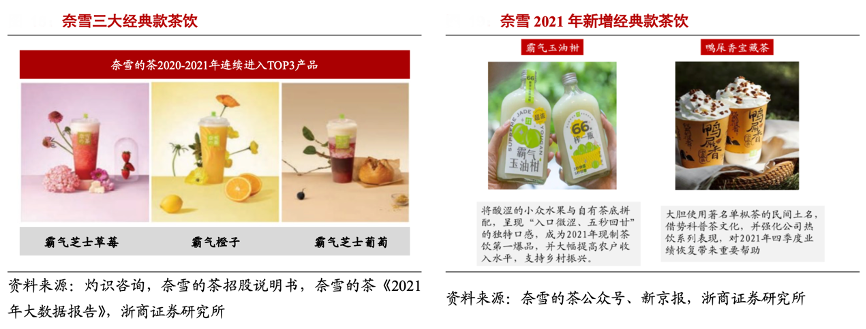 經典案例:根據灼識咨詢、奈雪的茶招股說明書、奈雪的茶《2021年大數據報告》、奈雪的茶公眾號、新京報、浙商證券研究所等綜合資訊表明,為了維持產品穩定的生命力,奈雪通過高頻高質量的季節款上新,不斷迭代升級核心菜單。以 2021 年奈雪推出的油柑、鴨屎香寶系列爆款產品為例,基于穩定的熱度和較高的復購率,公司已將其轉到經典產品線,為奈雪持續成長貢獻營收。