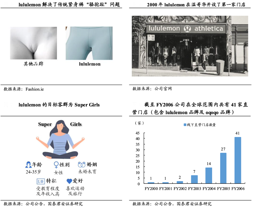 經(jīng)典案例:根據(jù)Fashion.ie、公司官網(wǎng)、公司公告、國(guó)泰君安證券研究等綜合資訊表明,通過(guò)對(duì)傳統(tǒng)瑜伽褲進(jìn)行功能性改良,Lululemon公司于 1998 年研發(fā)出核心面料 Luon,完美地解決了傳統(tǒng)緊身褲存在的“駱駝趾”等問(wèn)題,并迅速在瑜伽愛(ài)好者中建立起知名度與影響力。2000 年,lululemon 在溫哥華 開(kāi)設(shè)第一家線下實(shí)體店;截至FY2006,公司在全球范圍內(nèi)共有 41 家直營(yíng)門(mén)店(包含 lululemon 品牌及 oqoqo 品牌。