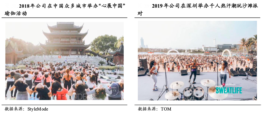 經(jīng)典案例:根據(jù)StyleMode、TOM、國(guó)泰君安證券研究等綜合資訊表明,針對(duì)中國(guó)市場(chǎng),2016年Lululemon公司在北京太廟、上海陸家嘴、成都大慈寺同期舉辦了“心展中國(guó)”(Unroll China)瑜伽活動(dòng)。2019 年,公司在 北京健景壹園舉辦了為期兩天的瑜伽音樂(lè)盛會(huì),在深圳舉辦了千人熱汗 潮玩沙灘派對(duì)。
