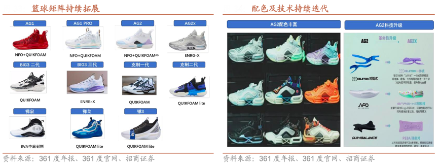 經典案例:根據361度年報、361度官網、招商證券等綜合資訊表明,361度籃球領域推出球星簽名戰靴提升影響力。其將 NFO、QU!KFOAM 等核心中底科技應用至籃球鞋提升性能,同時簽約可蘭白克、阿隆戈登、丁威迪等籃球明星提升品牌影響力,推出可蘭白克簽名戰靴克制系列、戈登簽名戰靴 AG 系列。