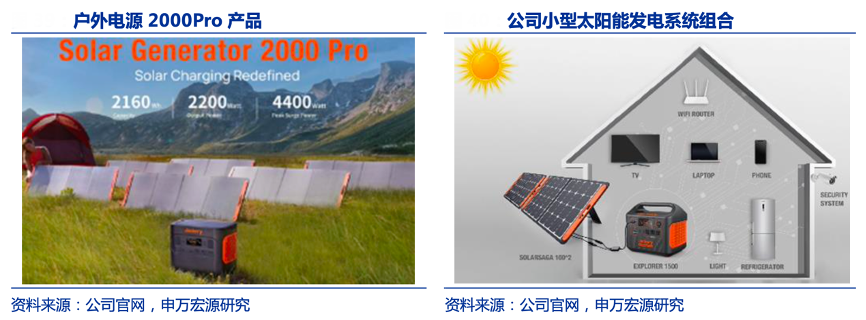 經典案例:根據公司官網、申萬宏源研究等綜合資訊表明,應急用電場景需要滿足大容量和大功率的要求,華寶新能公司已向市場推出了多款容量在 500Wh 以上且產品綜合性能更強的高容量產品,2022 年公司推出“便攜儲能產品+太陽能板”的多種小型太陽能發電系統組合。 2022 年 5 月,公司在 2022 全球發布會上正式發布光充戶外電源 2000Pro,與其他中小企業形成產品容量段方面的差異化競爭。