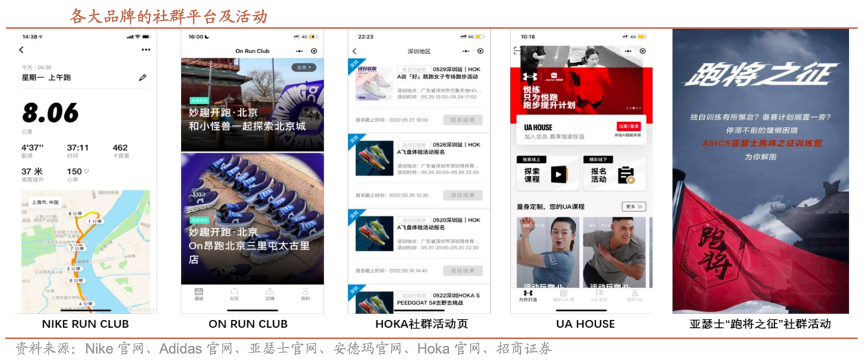 經(jīng)典案例:根據(jù)Nike官網(wǎng)、Adidas官網(wǎng)、亞瑟士官網(wǎng)、安德瑪官網(wǎng)、Hoka官網(wǎng)、招商證券等綜合資訊表明,各大跑鞋品牌積極創(chuàng)建品牌跑步俱樂部,直接觸達核心消費者。如 Nike 創(chuàng)立 NIKE RUN CLUB;阿迪達斯創(chuàng)立ADIDAS RUNNERS;New Balance 創(chuàng)立 NBRC; 美津濃創(chuàng)辦跑步訓練營等等;線上提供運動指導,并根據(jù)用戶需求推薦鞋款及跑步建議;線下定期策劃并舉辦各種課程指導及路跑活動,時常邀請運動領(lǐng)域 KOL 一同參與分享專業(yè)技巧。