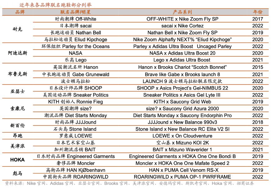 經(jīng)典案例:根據(jù)Nike官網(wǎng)、Adidas官網(wǎng)、亞瑟士官網(wǎng)、Brooks官網(wǎng)、美津濃官網(wǎng)、斯凱奇官網(wǎng)、安德瑪官網(wǎng)、Hoka官網(wǎng)、招商證券等綜合資訊表明,專業(yè)運動聯(lián)名強化運動基因,Nike 與專業(yè)運動員 Nathan Bell 聯(lián)名;Adidas 與 NASA 聯(lián)名; Brooks 與波士頓馬拉松聯(lián)名等。