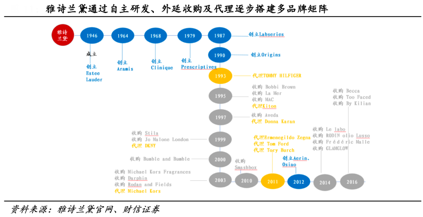 經典案例:根據雅詩蘭黛官網、財信證券等綜合資訊表明,集團在創(chuàng)立之初僅有雅詩蘭黛這一單個品牌,在雅詩蘭黛在全球市場具備一定規(guī)模后,便開始自主研發(fā)品牌,先后孵化出 Armis、 倩碧等品牌,至今集團體內擁有 6 個內生孵化的品牌,定位覆蓋男士護膚、皮膚科護 膚、天然護膚等。同時其在 1995 年、2014 年、2016 年三個時間段內,集團按需收購以補充細分領域,收購的 15 個品牌定位于彩妝、護發(fā)、香氛、面膜、功效護膚品等不同賽道上。