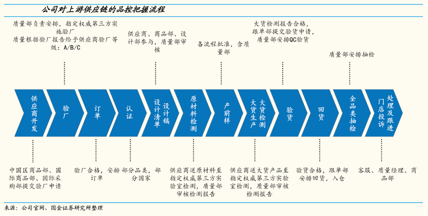 經(jīng)典案例:根據(jù)公司官網(wǎng)、國(guó)金證券研究所等綜合資訊表明,名創(chuàng)優(yōu)品公司對(duì)上游供應(yīng)鏈通過精細(xì)化管理進(jìn)行品控把握,制定 12 個(gè)環(huán)節(jié)進(jìn)行品控的嚴(yán)格管理,其中最重要的四個(gè)環(huán)節(jié)是驗(yàn)廠、產(chǎn)品內(nèi)測(cè)、驗(yàn)貨、投訴處理。
