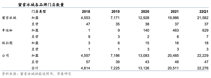 經典案例:根據蜜雪冰城招股說明書、華泰研究等綜合資訊表明,蜜雪冰城公司以直營為引導,加盟為主體進行擴張。直營門店由公司直接設立,享受門店銷售商品收益、承擔門店開支;加盟門店由公司進行審核批準,公司向加盟商收取固定的加盟費/管理費/培訓費等及向加盟商提供食材/設備/運營指導等。蜜雪冰城主要以加盟模式進行擴張,截至 22Q1,全國共有 22,276 家門店,其中 22,229 家為加盟門店。