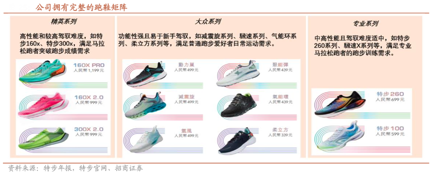 經典案例:根據特步年報、特步官網、招商證券等綜合資訊表明,特步公司利用優質材料和結構開發多元化功能性跑鞋,擁有針對大眾跑者、專業跑者、精英跑者需求的三條主要產品線,依托中底技術升級不斷迭代現有產品系列,滿足跑者多元化需求。
