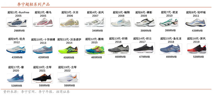 經典案例:根據李寧年報、李寧官網、招商證券等綜合資訊表明,李寧公司自 2005 年開發超輕系列,超過 15 年的開發經驗使得公司在跑鞋輕量化和性能 調校上擁有較強的技術儲備。從第三代開始,其在自然界中尋找力學平衡,實現兼具輕質與性能;目前超輕系列已經推出第 19 代產品,并廣受好評。
