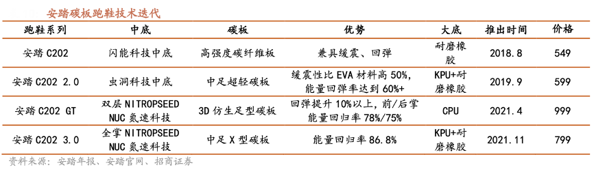 經典案例:根據安踏年報、安踏官網、招商證券等綜合資訊表明,2021年安踏推出 C202 GT,正式大范圍推廣碳板競速跑鞋,中底材料由閃能科技升級為雙層 NITROSPEED NUC 氮素科技泡棉,提供出色的緩震和回彈能力,內置 3D 仿生足碳板,更加貼合足型,提供強勁的推進力。