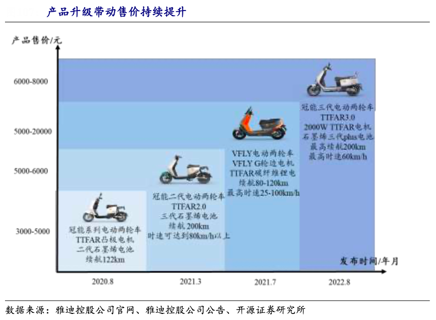 經(jīng)典案例:根據(jù)雅迪控股公司官網(wǎng)、雅迪控股公司公告、開源證券研究所等綜合資訊表明,作為雅迪控股的主打產(chǎn)品之一,冠能系列在 2021 年進(jìn)行大規(guī)模市場推廣,2021H1 銷量占總銷量的比重為24%,其產(chǎn)品售價不斷提升,冠能系列一代、二代、三代的價格帶分別為 3000-5000元、5000-6000元、6000-8000 元,毛利率有望進(jìn)一步提高。