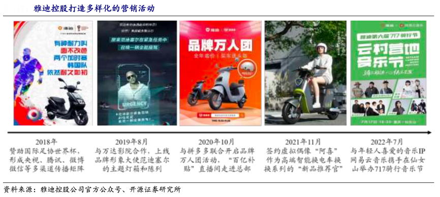 經(jīng)典案例:根據(jù)雅迪控股公司官方公眾號、開源證券研究所等綜合資訊表明,2018 年,雅迪控股贊助國際足協(xié)世界杯,形成央視、騰訊、微博、微信等多渠道傳播矩陣;而2022年7月,雅迪控股與年輕人喜愛的音樂 IP 網(wǎng)易云音樂攜手在仙女山舉辦 717 騎行音樂節(jié)。雅迪控股通過贊助、代言,以及 IP 聯(lián)動等多種方式,拓寬渠道,增強(qiáng)消費者對品牌的認(rèn)知程度。