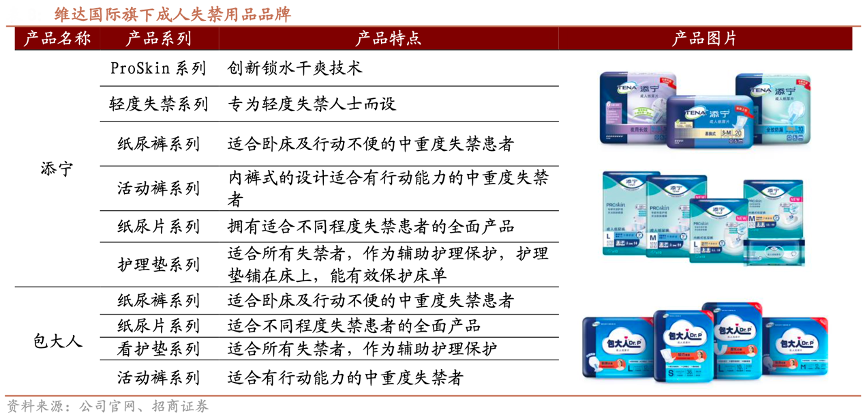 經典案例:根據公司官網、招商證券等綜合資訊表明,維達公司旗下的成人失禁品牌自 2017 年起國內排名穩定于第三名,專注中高端產品。其旗下有添寧和包大人兩大品牌,覆蓋各類產品,適用于不同需求的人群,中添寧在全球 范圍、歐洲、拉丁美洲均排名第一。