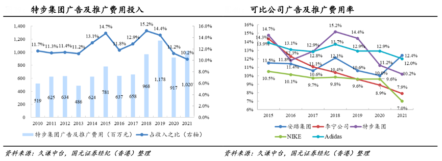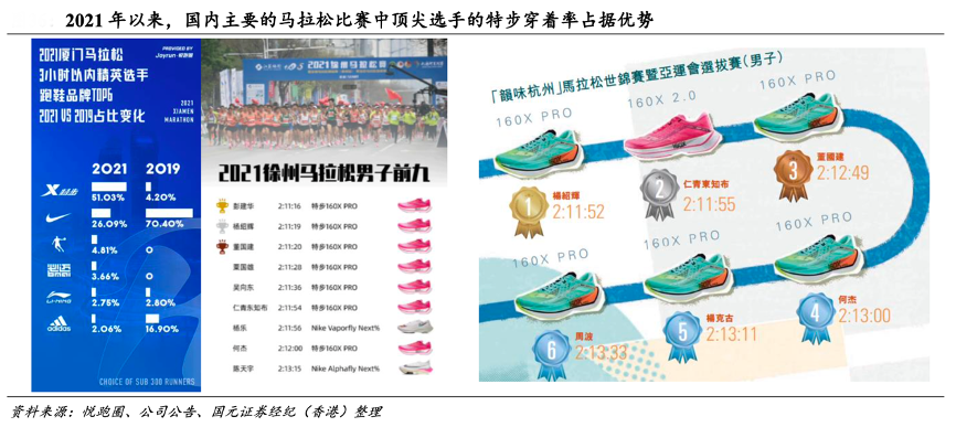 經(jīng)典案例:根據(jù)悅跑圈、公司公告、國(guó)元證券經(jīng)紀(jì)(香港)等綜合資訊表明,目前特步為中國(guó)田徑協(xié)會(huì)馬拉松合作伙伴,在 2019 年以來 聯(lián)手中國(guó)田協(xié)推動(dòng)“國(guó)人競(jìng)速、全民暢跑”戰(zhàn)略,是中國(guó)贊助馬拉松賽事最多的 體育品牌,疫情前的 2019 年贊助馬拉松比賽超過 50 場(chǎng)。特步品牌通過大眾系列-專業(yè)系列-精英系列三條產(chǎn)品線構(gòu)筑跑步生態(tài)圈,以產(chǎn)品為基,采取專業(yè)運(yùn)動(dòng)與運(yùn)動(dòng)時(shí)尚雙軌營(yíng)銷的策略。