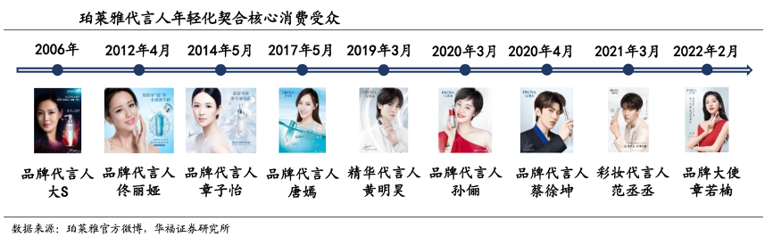 經典案例:根據珀萊雅官方微博、華福證券研究所等綜合資訊表明,珀萊雅針對不同受眾的產品系列選取與之相契合的代言人,以大單品系列為例,品牌代言人中,孫儷偏向紅寶石系列的宣傳,而粉絲受眾較年輕的蔡徐坤偏向雙抗系列的宣傳,粉絲畫像與產品功效相匹配,形成高效傳播。