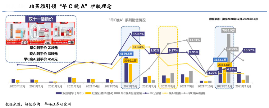 經典案例:根據解數咨詢、華福證券研究所等綜合資訊表明,珀萊雅結合成功傳播的“早 C 晚 A”概念,2021 年 6 月推出雙抗精華+紅寶石精華套裝,相對于獨立單品,采取低件單價、高客單價的產品策略,前期種草鋪設和持續進行消費者教育,2021 年雙 11 期間實現“早 C 晚 A”套裝的爆發,2021 年 11 月在淘系平臺以 7965.9 萬元的銷售 額超越兩大單品 GMV 之和,淘系平臺的銷售占比達到 10.99%。