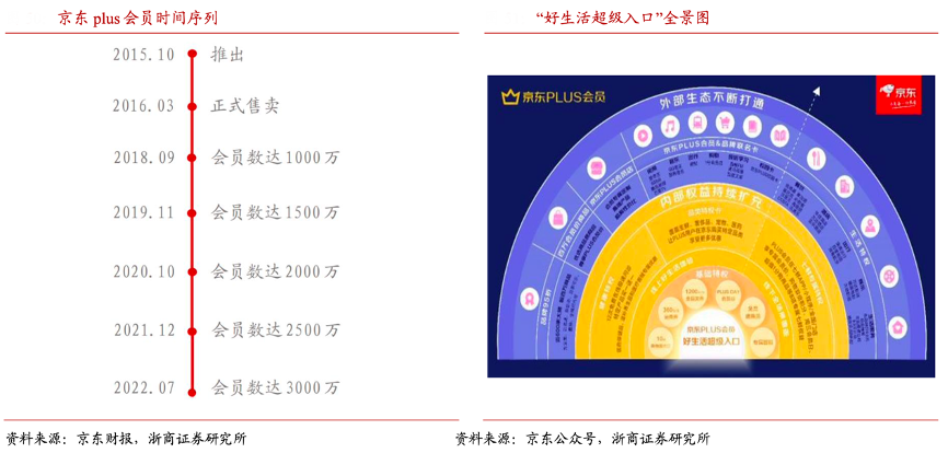 經(jīng)典案例:根據(jù)京東財報、京東公眾號和浙商證券研究所等綜合資訊表明,京東 plus 是國內首個付費電商會員體系,京東通過“內部權益持續(xù)擴充”和“外部生態(tài)不斷打通”,一方面基于京東內部生態(tài)整合京東各業(yè)務線的消費和服務權益,另一方面引入外部品牌打造多元“權益聯(lián)盟”,為用戶提供優(yōu)質的消費體驗,提升用戶粘性和活躍度。截至 2022 年 7 月,京東 PLUS 會員 數(shù)量突破 3000 萬,平均年消費額超過非 PLUS 會員的 8 倍。
