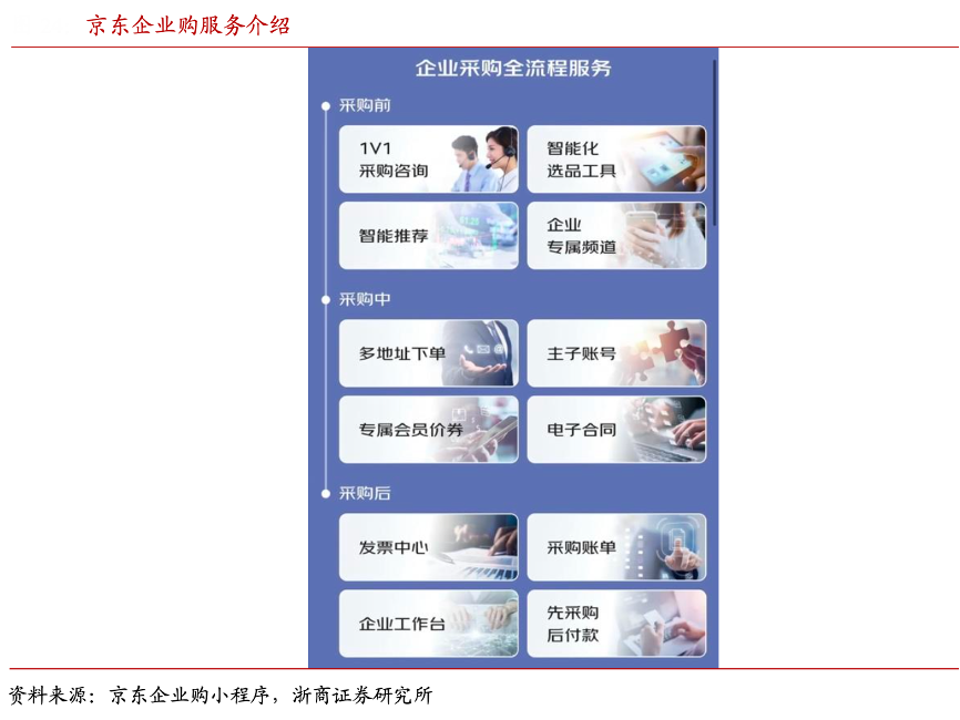 經(jīng)典案例:根據(jù)京東企業(yè)購小程序、浙商證券研究所等綜合資訊表明,對于中小企業(yè)而言,京東企業(yè)購圍繞企業(yè)采購鏈條上的八大觸點,在選品/議價/簽約直至報銷、采購決策等服務流程中實現(xiàn)增效,從源頭為企業(yè)會員節(jié)省采購成本;據(jù)京東企業(yè)購微信小程序顯示,京東企業(yè)會員年均綜合降本可超過45%。