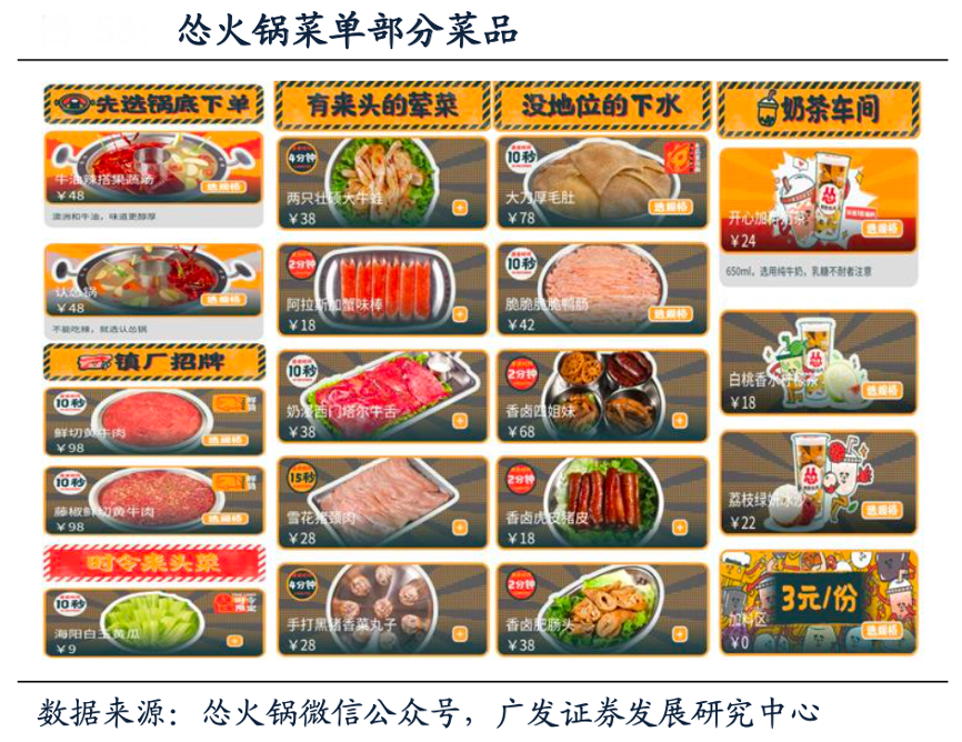 經典案例:根據慫火鍋微信公眾號、廣發證券發展研究中心等綜合資訊表明,慫火鍋將川味火鍋和潮汕牛肉火鍋進行融合,產品口號為“靈魂是鍋底,頭牌是牛肉”,主打鮮切黃牛肉和澳洲和牛油鍋底,店員會通過“干盤掛肉、倒盤不掉”的方式來展示黃牛肉的新鮮,鍋底選用澳 洲和牛油,自家工廠煉油炒料。慫火鍋還明文向顧客承諾“不新鮮就退菜,不好喝就重做”。