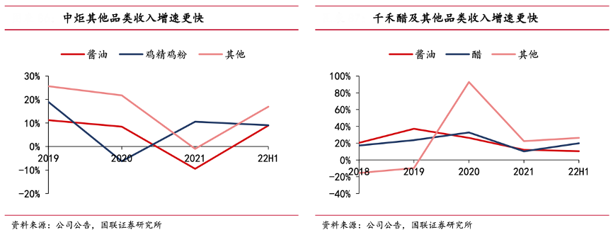 經(jīng)典案例:根據(jù)公司公告、國聯(lián)證券研究所等綜合資訊表明,中炬其他類調(diào)味 品(蠔油、醋、料酒、腐乳等)近三年保持高雙位數(shù)增長,明顯快于醬油的個位數(shù)。千禾的醋與醬油增速均在 20%左右,料酒等其他類別從 2020 年開始起勢,近兩年平均增速接近 50%。