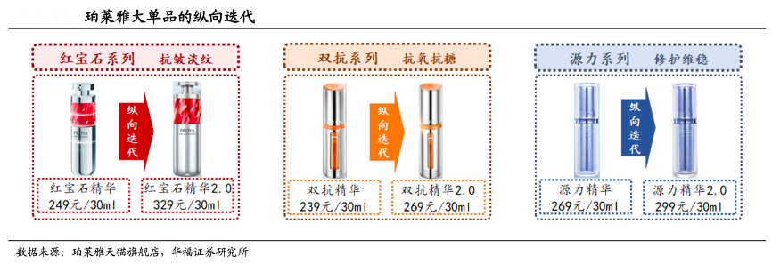 經典案例:根據珀萊雅天貓官方旗艦店、華福證券研究所等綜合資訊表明,珀萊雅初推大單品時憑借極致性價比在精華品類的競爭紅海中突出重圍,聚焦消 費者護膚痛點,2020年 2 月和 4 月其接連推出主打抗皺淡紋功效的紅寶石精華、主打抗氧抗糖功效的雙抗精華,后續通過縱向迭代,升級配方和產品使用感,產品價格進階。