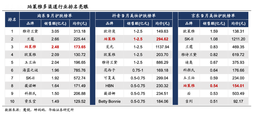 經典案例:根據魔鏡、蟬媽媽、華福證券研究所等綜合資訊表明,珀萊雅公司的多渠道強運營能力直觀表現在銷售額及排名的亮眼成績上,以 2022 年 9 月數據為例,珀萊雅在淘系/抖音/京東渠道化妝品排名中分列國貨品牌第 1/第 2/第 1,全行業第 3/第 2/第 8,銷售額分別 達到 2.48 億元/1-2.5 億元/0.54 億元。其中淘系平臺 9 月銷售額超越傳統強勢國際品 牌歐萊雅、玉蘭油。