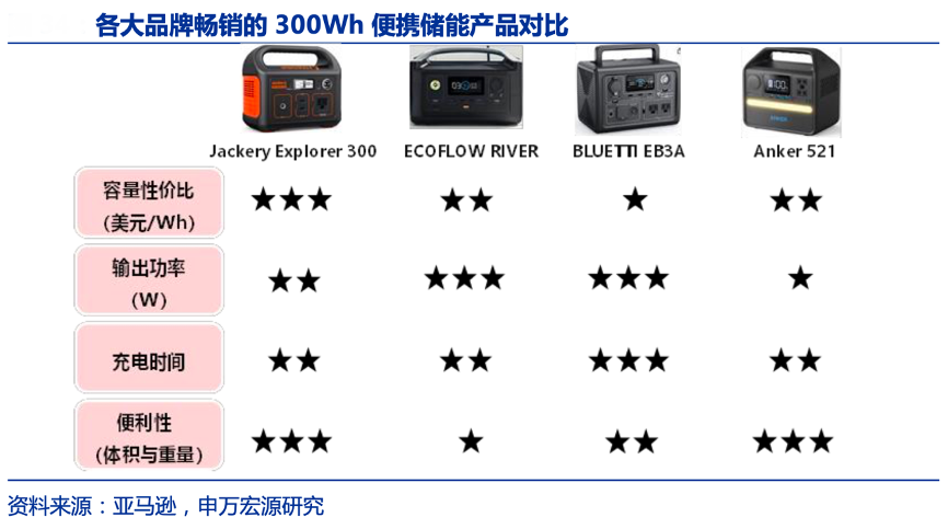 經典案例:根據亞馬遜、申萬宏源研究等綜合資訊表明,戶外場景下,消費者對于便攜儲能的要求主要聚焦在性價比、輸出功率、充電時長和便利性上。華寶新能公司中小容量 產品針對戶外場景主打性價比和便利性的特點,以 Explorer 300 為例,通過對比行業內同類型產品,公司產品在相同容量下價格更具優勢,且重量輕便體積較小,綜合性能優異。