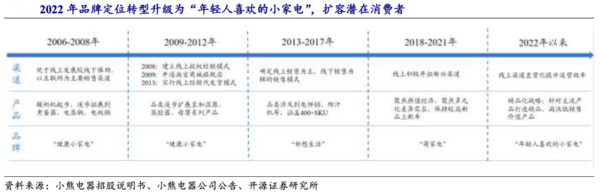 經典案例:根據小熊電器招股說明書、小熊電器公司公告、開源證券研究所等綜合資訊表明, 2022 年 5 月小熊電器提出品牌戰略升級規劃積極求變,品牌定位由原先的“萌家電”轉換為“年輕人喜歡的小家電”,產品端聚焦精品化戰略,更加注重產品的創新、品質和涉及等。