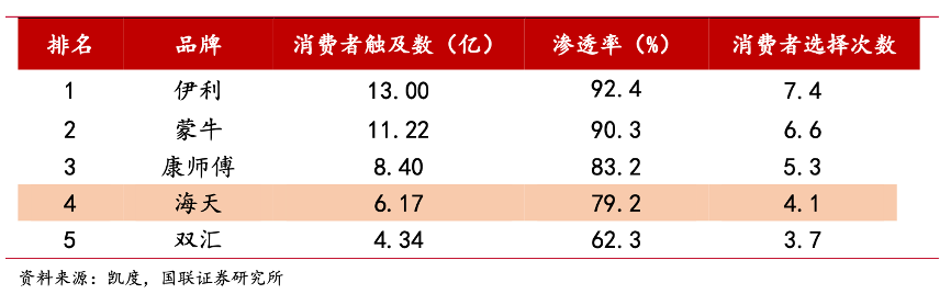 經典案例:根據凱度、國聯證券研究所等綜合資訊表明,海天在快消品中消費者觸及數位列第四,且保持近10%增速。凱度消費者指數發布的《2022 年亞洲市場品牌足跡》顯示,2021年海天消費者觸及數為6.17億,在消費者十大首選品牌榜單中,海天消費者觸及數增長最快(9.7%)。海天是十大首選品牌榜單中唯一的調味品企業,其在調味品行業中具備其他企業無法比擬的品牌影響力。
