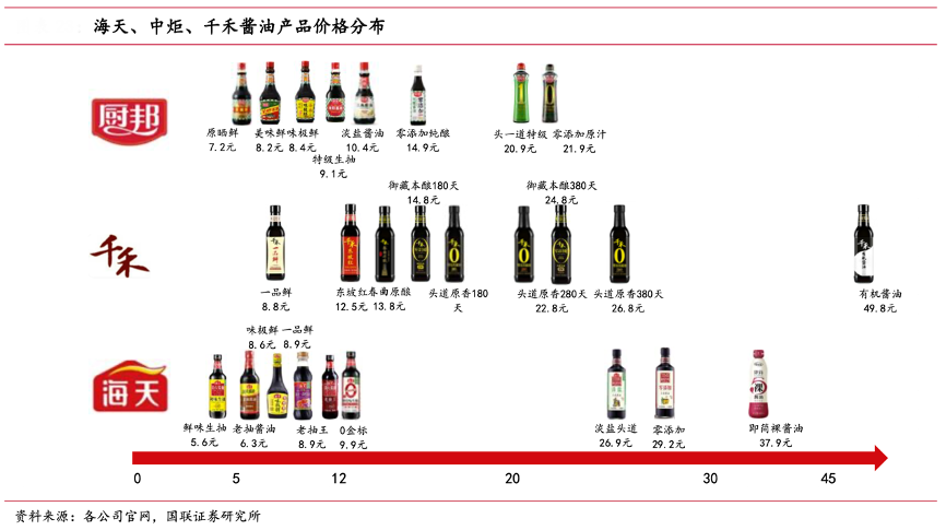 經典案例:根據各公司官網、國聯證券研究所等綜合資訊表明,千禾以成為零添加醬油的第一品牌為目標,在業內首次推出“零添加”醬油產品。2018 年 11 月,全國開始統一升級包裝,強化零添加概念,提升品牌整體形象,已形成零添加為主、高鮮為輔的產品格局。高鮮醬油補位 10-15 元/500ml 價格帶, 輔助零添加產品進行市場推廣。有機醬油重塑高端天花板,有機醬油和天元有機的指 導價分別 49.8 元/500ml,298 元/500ml。