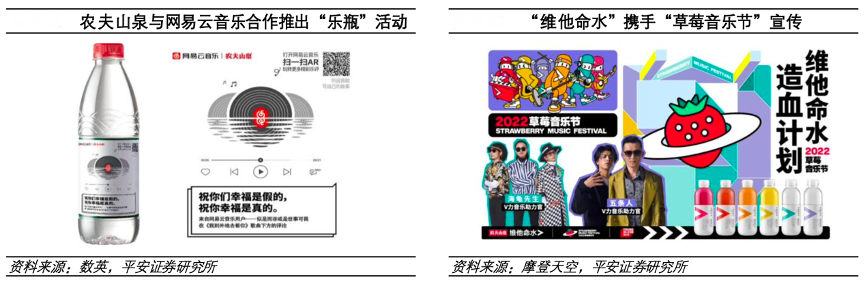 經典案例:根據數英、摩登天空、平安證券研究所等綜合資訊表明,農夫山泉2017 年與網易云音樂合作推出“樂瓶”聯名活動,精選了 52 條音樂評論并印制在樂瓶瓶身,在本活動中推出約4億瓶“有故事的水”引發消費者強烈的情感共鳴。同時,2021-2022年,公司旗下“維他命水”攜手“草莓音樂節”、“草莓 MDSK 音樂節”宣傳,進一步提高了品牌在年輕消費者中的知名度。