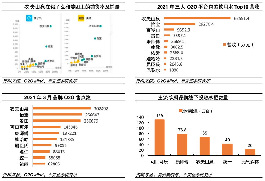 公司在 O2O 平臺上終端網點數居行業首位,據 O2O Mind 大數據統計,2021 年農夫山泉在餓了么及美團平臺上的鋪貨率已超過 80%,在前三大 O2O 平臺(美團、餓了么和京東到家)上營收達 6.26 億元,遠高于行業其他品牌。