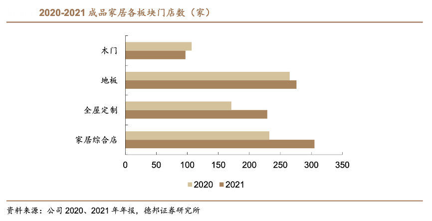 經(jīng)典案例:根據(jù)公司2020、2021年年報(bào)、德邦證券研究所等綜合資訊表明,結(jié)合全屋定制模式下“一站式采購(gòu)”需求,兔寶寶公司成品家居業(yè)務(wù)推出健康 家居生活館,打造“全屋定制+木門(mén)+地板”多品類(lèi)綜合門(mén)店,通過(guò)推出全屋定制 提升門(mén)店客單值,提高經(jīng)銷(xiāo)商的盈利能力。2021 年,公司對(duì)部分地板和木門(mén)店 進(jìn)行整合,同時(shí)新增家居專(zhuān)賣(mài)店 162 家,截至去年末,公司成品家居專(zhuān)賣(mài)店共 907 家。