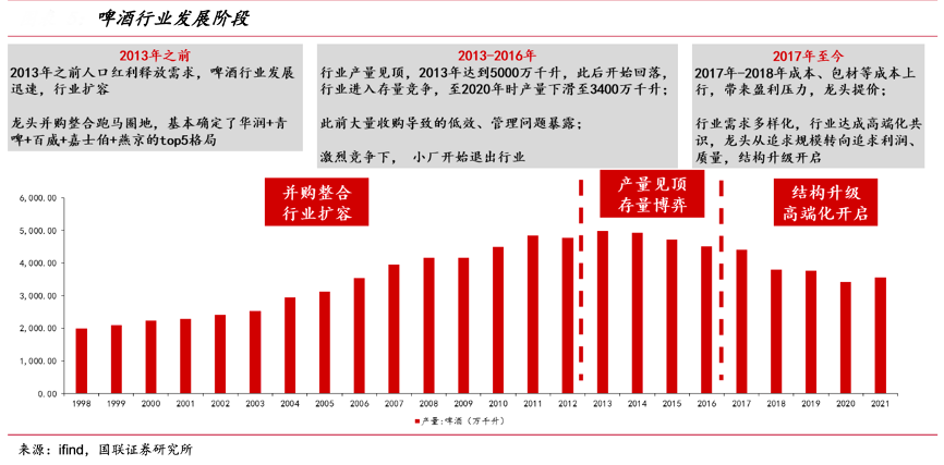 經典案例:根據(jù)ifind、國聯(lián)證券研究所等綜合資訊表明,從產量和企業(yè)戰(zhàn)略角度復盤,啤酒行業(yè)的發(fā)展可以分為三個階段:2013 年之前,行業(yè)處于持續(xù)擴容期,各龍頭公司跑馬圈地,基本形成了行業(yè)前五的競爭格局; 2013-2016 年,行業(yè)產量達到 5000 萬千升后見頂,并購導致的低效率等問題開始暴露,龍頭公司歷史包袱沉重,行業(yè)開啟激烈的存量競爭,部分小廠退出;2017 年至今,龍頭公司達成高端化共識,從追求規(guī)模轉向追 求質量和利潤,行業(yè)進入結構升級階段。