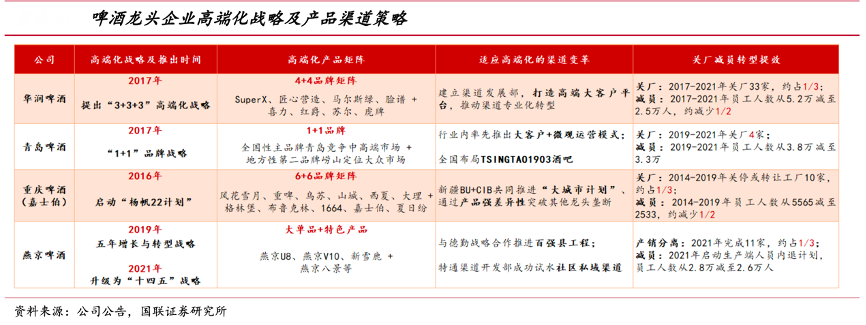 經典案例:根據(jù)公司公告、國聯(lián)證券研究所等綜合資訊表明,在行業(yè)產量見頂?shù)谌旰螅?016年重慶啤酒在行業(yè)內率先提出了高端化戰(zhàn)略“揚帆 22 計劃”,2017年華潤啤酒和青島啤酒緊隨其后,分別提出“3+3+3”戰(zhàn)略、開啟“1+1”品牌戰(zhàn)略。至此,高端化成為啤酒行業(yè)共識,龍頭公司紛紛轉向高端化競爭,開啟產品和渠道高端化,提升品牌形象的同時加速提效減虧,追求高質量發(fā)展。