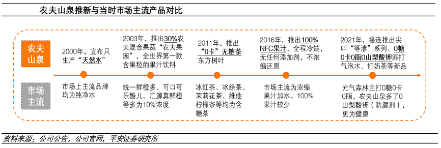 經(jīng)典案例:根據(jù)公司公告、公司官網(wǎng)、平安證券研究所等綜合資訊表明,農(nóng)夫山泉公司的產(chǎn)品關(guān)注消費者長期健康的需求,推新會以更長的時間維度去布局,在行業(yè)盛行 10%低濃度果汁飲料時,公司在 2003 年即推出 30%濃度的混合果蔬汁飲料 “農(nóng)夫果園”,是全世界第一款含果粒的果汁飲料。