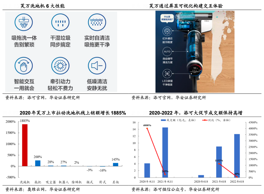 經典案例:根據添可官網、奧維云網、添可微信公眾號、華安證券研究所等綜合資訊表明,2020年雙 11 期間,添可全渠道成交突破 4.1 億元,截至 2022 年 618 期間,添可全渠道成交額突破 12 億元,同比+40%,其中線下門店成 交額突破 2 億元,同比+100%,芙萬系列洗地機在天貓和京東渠道市占率分別達到 60%、 66%,高市占、高成長勢頭依舊延續。