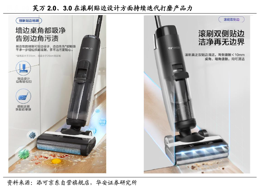 經典案例:根據添可京東自營旗艦店、華安證券研究所等綜合資訊表明,科沃斯的芙萬 3.0 進一步提升產品力,采用浮動刮條雙邊貼邊,并升級為雙向智能助力系統(2.0 版本為單向)改善操作簡便性,在續航、屏顯、電解水除菌、水箱容量等方面都較芙萬 2.0 有不同程度提升。2021年“黑五”購物節期間,添可在美國、德國亞馬遜洗地機品類中均排名第一。