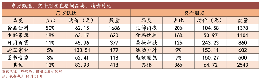 經典案例:根據蟬媽媽、財通證券研究所等綜合資訊表明,對比東方甄選和交個朋友直播間的商品,東方甄選品類集中度較高,以食品飲料為主;交個朋友品類分布相對均勻,以服飾內衣為主。同時東方甄選商品數量相對較少,均價較低且價格區間較窄;交個朋友直播間商品數量相對更豐富,偏向全品類覆蓋,均價相對更高,價格區間更廣。