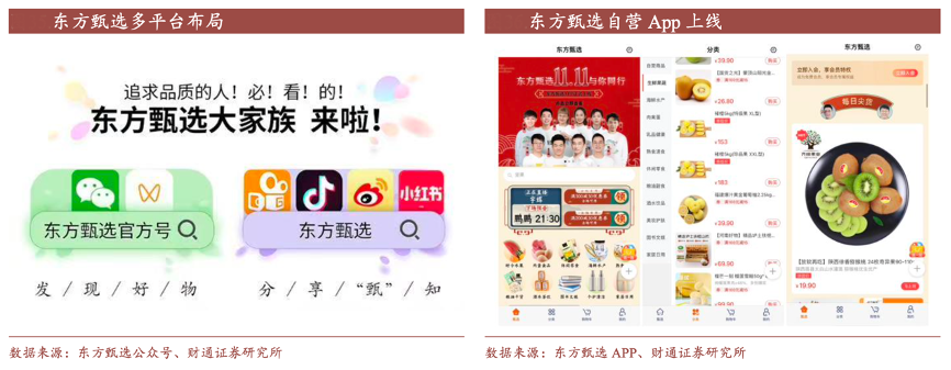經典案例:根據東方甄選公眾號、東方甄選APP、財通證券研究所等綜合資訊表明,東方甄選在抖音平臺外,前瞻布局微信公眾號及視頻號,在快手、微博、小紅書也建立了官方賬號,淘寶平臺開設官方旗艦店;目前東方甄選獨立 App 也已上線,購物 App 中既包含自營品類,也包含第三方商家產品。